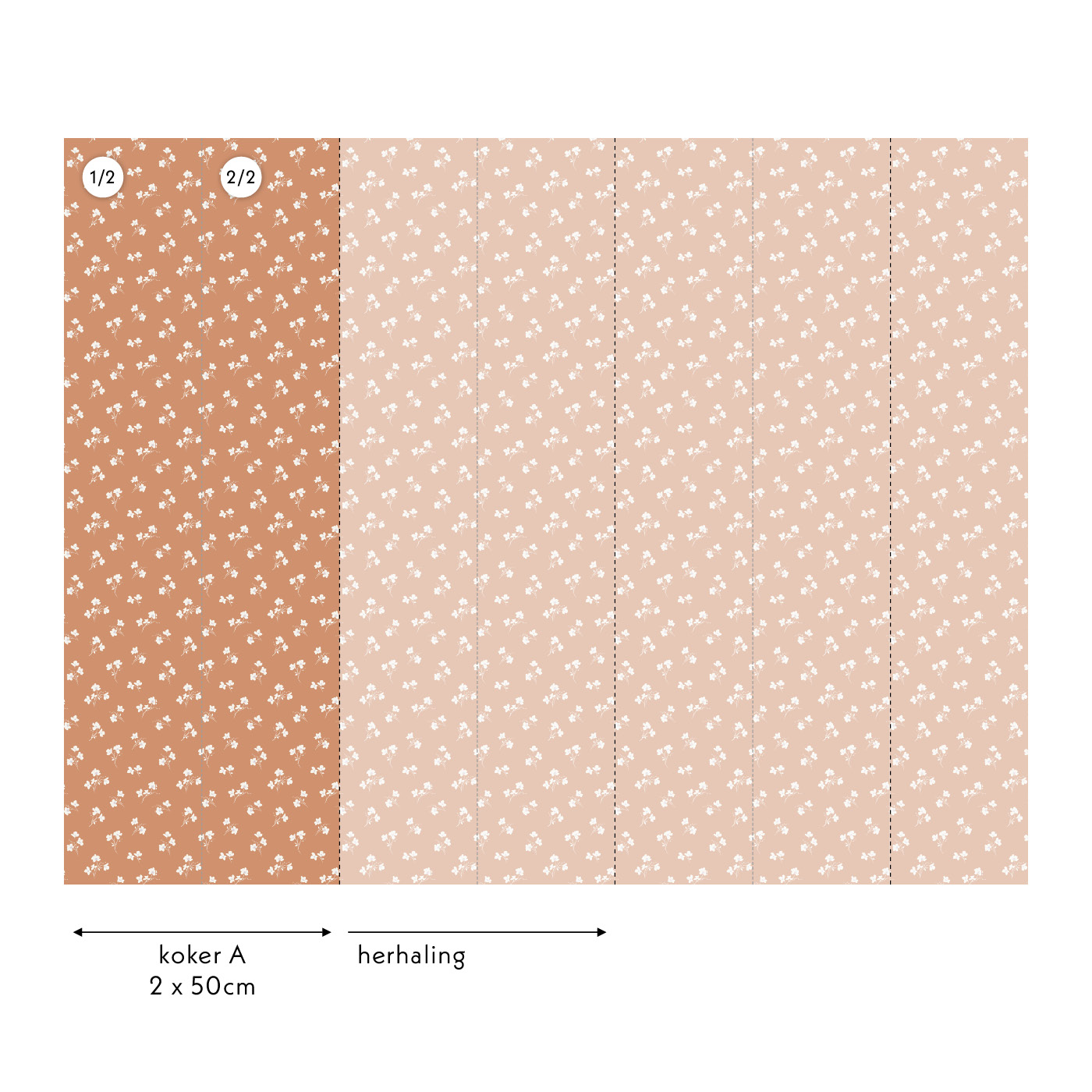 Iedere meter bestaat uit twee banen van 50cm breed en 270cm hoog. De kokers waarin de banen zitten zijn gemarkeerd met letters voor de opeenvolgende banen. Plak de banen naast elkaar voor een perfect naadloos en doorlopend patroon.