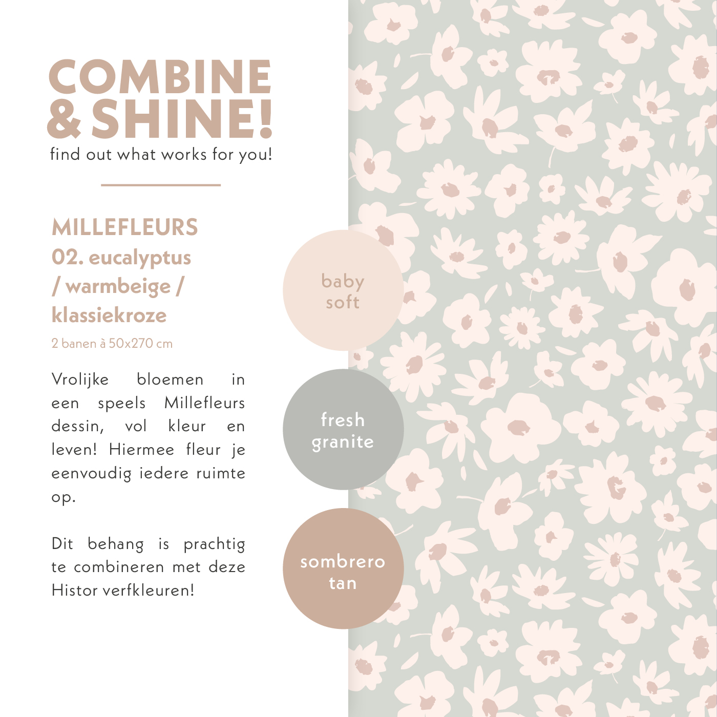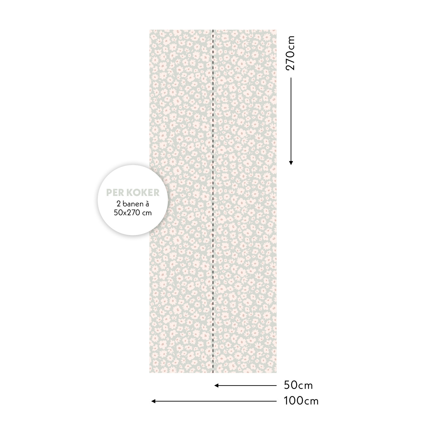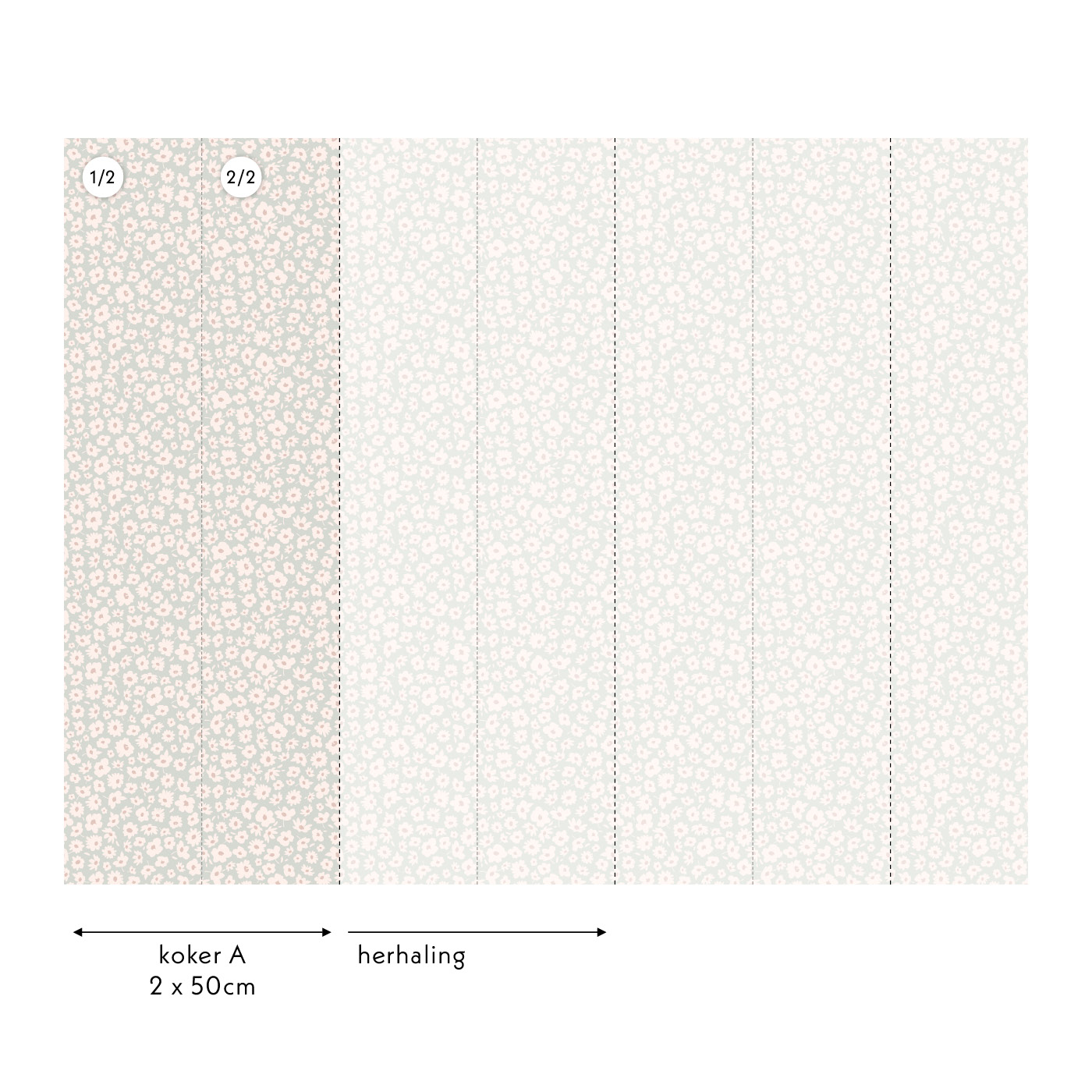 Behang Millefleurs 02. eucalyptus/warmbeige/klassiekroze