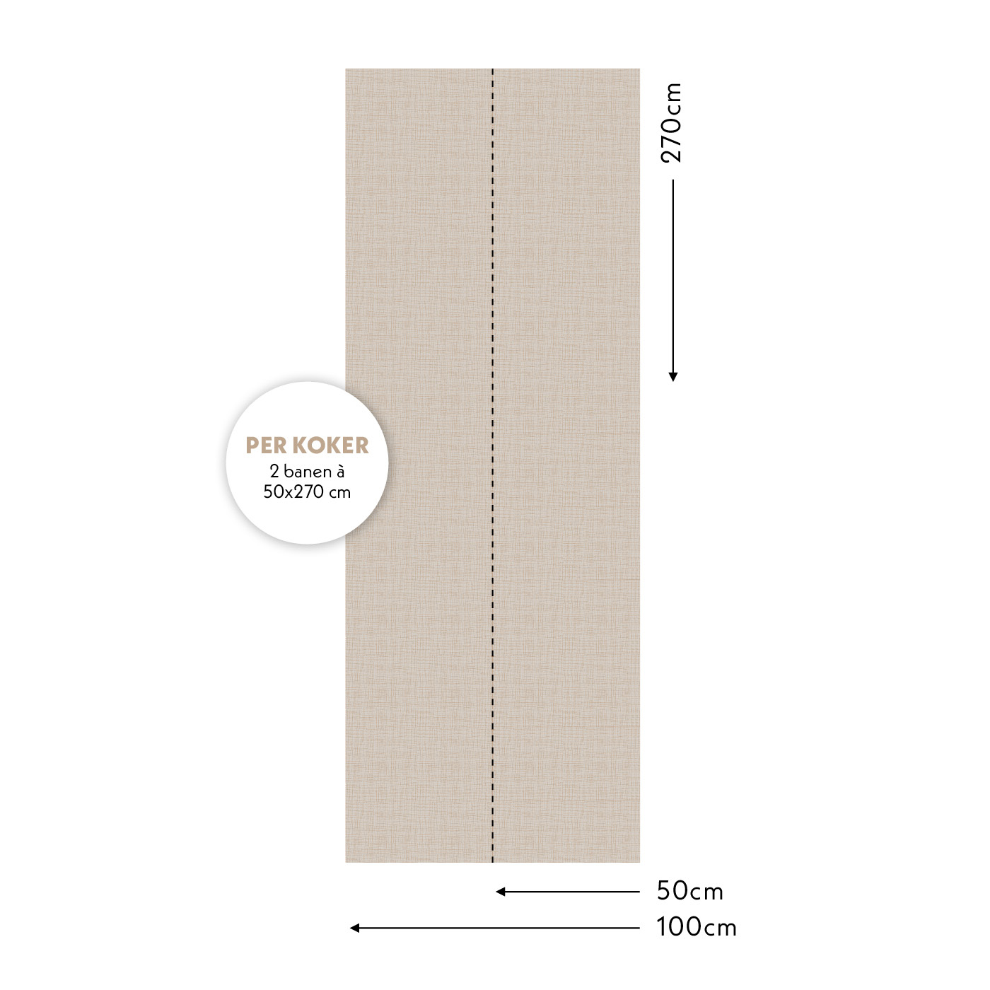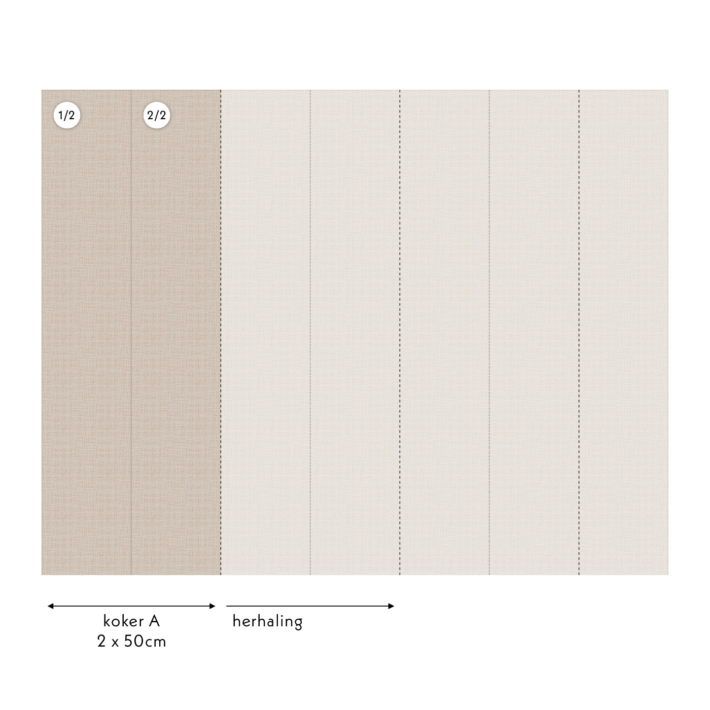 Iedere meter bestaat uit twee banen van 50cm breed en 270cm hoog. De kokers waarin de banen zitten zijn gemarkeerd met letters voor de opeenvolgende banen. Plak de banen naast elkaar voor een perfect naadloos en doorlopend patroon.