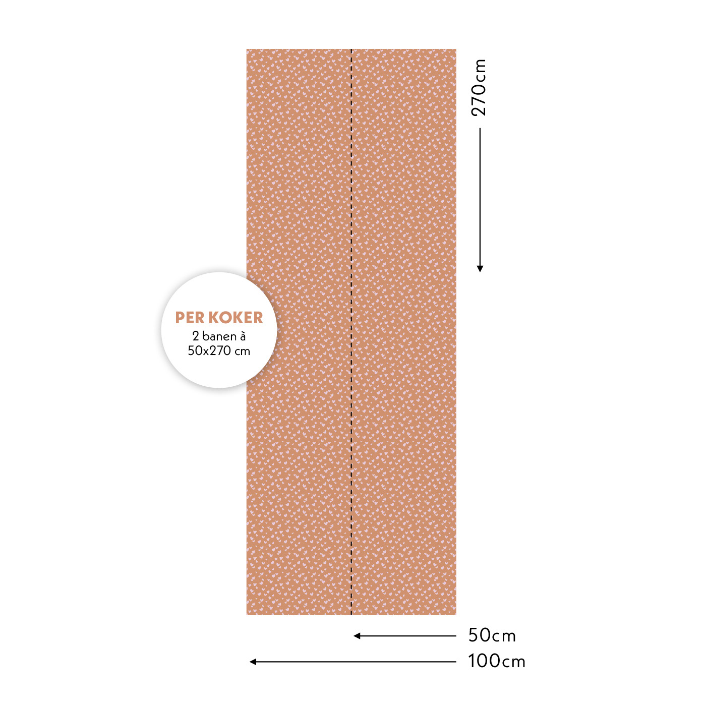 Iedere meter bestaat uit twee banen van 50cm breed en 270cm hoog. De kokers waarin de banen zitten zijn gemarkeerd met letters voor de opeenvolgende banen. Plak de banen naast elkaar voor een perfect naadloos en doorlopend patroon.