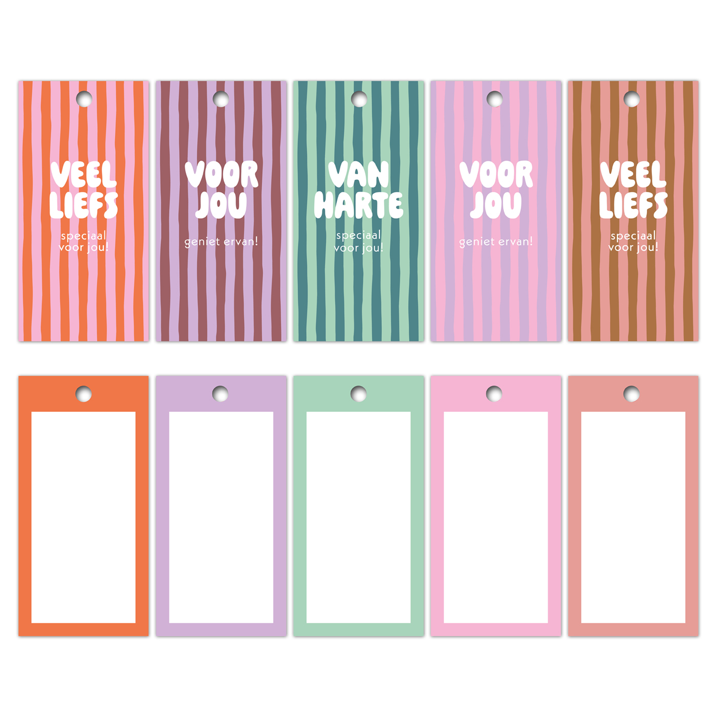 De cadeaulabels zijn dubbelzijdig bedrukt met watergedragen inkt en voorzien van een boorgat. Op de achterzijde is ruimte voor een persoonlijke boodschap. 4x8cm. 100 stuks: 5 soorten, 20 van ieder.