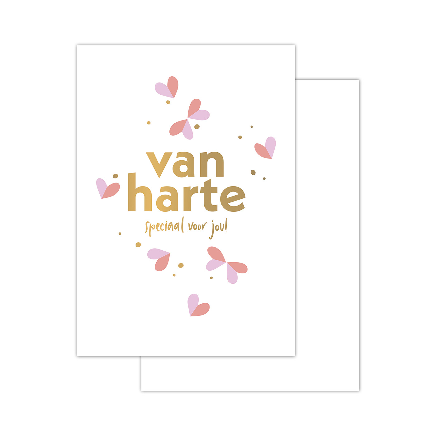 7,4×10,5cm (A7). Enkelzijdig bedrukt, voorzien van goudfolie. 350 grams papier. 20 stuks. Advies verkoop per stuk € 0,75.